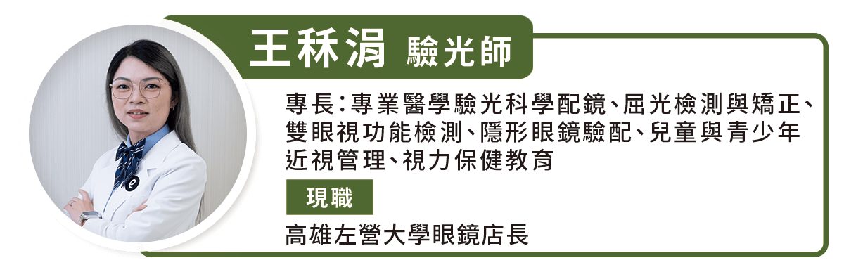 王秝涓驗光師:我們採用雙師驗配的服務模式,確保您的眼睛健康與配鏡準確。流程上,無論您先到大學眼科或大學眼鏡門市,我們都會進行全面的檢查。若驗光師在檢查度數時,發現您的視力品質不佳,疑似有白內障、黃斑部病變等眼疾,會立即轉介給眼科醫師做診斷。