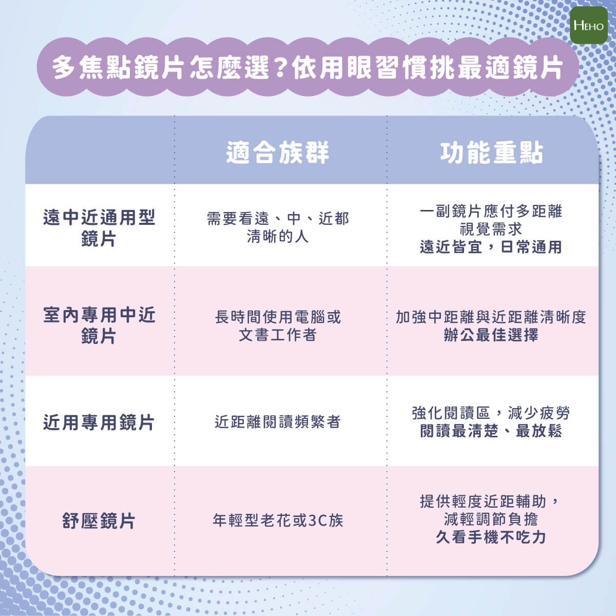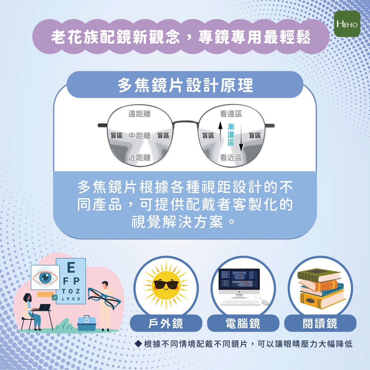 - 辦公族:可根據需求選擇 1–4 公尺的「室內專用中近鏡片」,在辦公室無論是文書、螢幕距離或室內辦公更輕鬆。